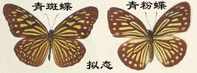 蝴蝶的擬態(tài)現(xiàn)象曾有過大量的研究,且是一個(gè)爭(zhēng)論不休的話題。在熱帶蝴蝶中有如此眾多的蝴蝶在外形上非常相似而事實(shí)上卻是完全不同的種或不同的科,這無(wú)疑是最令人注目而又非常有趣的現(xiàn)象之一。擬態(tài)的概念是基于這樣的設(shè)想:某些種類的蝴蝶對(duì)鳥及其他捕食性天敵來說是令其厭惡的,不可口的或不可食的,且這些種類具有醒目的“警告”色讓捕食者識(shí)別而避開它們;另一些無(wú)害而又很可口的蝴蝶則采用了類似的花紋以獲得保護(hù),因?yàn)椴妒痴哒`以為它們是不可口的種類而離之而去。不可口的蝴蝶被當(dāng)作“模型”,而可口的種類則被稱為“模擬型”。