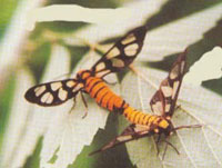 鹿蛾科(Amatidae)小至中等大蛾類,外形似斑蛾或黃蜂。喙發(fā)達,但有時退化,下唇須短而平伸,長而向下彎或向上翻,頭小,觸角絲狀或雙櫛伏。胸足脛節(jié)距短,腹部常具斑點或帶。翅面常缺鱗片,形成透明窗;前翅矛形、頗窄,翅頂稍圓,中室為翅長一半多;后翅顯著小于前翅。幼蟲色澤鮮艷,具有4對腹足、1對臀足,體表常具毛瘤,其上著生長毛簇,腹足趾鉤半環(huán)形;蛹光滑、堅硬、有繭。