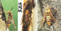 透翅蛾翅面狹窄,缺鱗片,透明,外形十分象膜翅目的馬蜂。多數(shù)種類的成蟲都白天活動(dòng),尤其喜在陽光下飛翔。觸角棍棒狀,末端有毛,雄蛾有齒或梳狀。胸部粗壯,腹部長(zhǎng)伸,飛翔迅速,常到花叢取食花蜜。幼蟲蛀食樹干、樹枝或樹根,林木和果樹被鉆蛀致枯死,往往造成很大的損失。