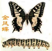 金鳳蝶屬鱗翅目鳳蝶科,完全變態(tài)。金鳳蝶廣布于全國各地,春、秋兩季捕捉其幼蟲(茴香蟲)以酒醉死, 焙干研成粉。本品的功效在于溫中散寒,理氣止痛?芍挝覆, 小腸氣等。