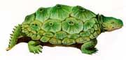最早的龜鱉類化石是發(fā)現(xiàn)于南非二疊紀(jì)地層中的正南龜。這是一種只有10幾厘米長的小動(dòng)物,化石保存得很破碎。保存較好的骨骼表明,正南龜在頜骨上和腭部邊緣長有細(xì)小的牙齒;肩部與薦部部之間有9個(gè)引長了的脊椎骨,但是只有8對(duì)肋骨;不過這8對(duì)肋骨卻十分與眾不同,每一塊都變得很寬,并且與鄰接的肋骨前后接觸,這種狀況正好體現(xiàn)了龜鱉類在進(jìn)化的道路上向發(fā)展出龜甲的方向特化的開始。 三疊紀(jì)出現(xiàn)的龜鱉類已經(jīng)進(jìn)化到了典型的現(xiàn)代龜鱉類的適應(yīng)輻射道路上了。例如,原顎龜頭骨數(shù)目已經(jīng)減少,牙齒已經(jīng)從腭骨邊上消失,身體已經(jīng)長出了保護(hù)性的堅(jiān)硬甲殼。這些特征都是最基本的龜鱉類的適應(yīng)方向,以后的龜鱉類的進(jìn)化只不過是在原顎龜身上已經(jīng)確立的這些特征的完善化。例如,以后的龜鱉類的牙齒全部消失了,而原顎龜在腭骨內(nèi)部還保留著牙齒;更進(jìn)步的龜鱉類發(fā)展了把頭、四肢和尾巴縮進(jìn)殼里的能力,而原顎龜還不能如此。 龜鱉類是杯龍類的直接后裔,在它們整個(gè)的進(jìn)化歷史中,雖然頭蓋骨有次生性開孔以及骨頭的組成數(shù)目減少的現(xiàn)象,但是仍然趨向于保持著原始爬行動(dòng)物那樣的堅(jiān)固頭骨的特征。此外,龜鱉類也顯示出了許多在其長期的生存競爭中有用的適應(yīng)。例如,牙齒很早就從腭骨上消失,但是卻產(chǎn)生了角質(zhì)的喙嘴,成為一種有利的切割工具,對(duì)吃肉和吃植物都非常有效;肢體粗壯,在陸生種類中腳變短,而且趾數(shù)比原始爬行動(dòng)物減少,而在海龜中腳部則演變成大的鰭足狀的橈足。 但是,龜鱉類中真正特化的結(jié)構(gòu)是龜甲的發(fā)展——肋骨通過分化生長包裹了肢帶和肢骨的上節(jié)以支持保護(hù)性的骨質(zhì)背甲,同時(shí)腹面也發(fā)生了骨質(zhì)的腹甲;背甲和腹甲均被角質(zhì)的甲套所覆蓋,并在兩側(cè)互相連接。龜鱉類以這樣的方式進(jìn)化成裝甲車般的爬行動(dòng)物,雖然犧牲了靈活性而常被人們當(dāng)作行動(dòng)遲緩和笨拙的動(dòng)物代表,但是這種笨重的保護(hù)適應(yīng)卻經(jīng)得起時(shí)間的考驗(yàn),使得龜鱉類成為現(xiàn)生四足類脊椎動(dòng)物當(dāng)中最為古老的家族之一。 原顎龜在分類和系統(tǒng)發(fā)生上屬于原顎龜亞目,在它們之后出現(xiàn)的兩棲龜亞目在中生代時(shí)期分布廣泛并一直延續(xù)到新生代。中生代晚期,從兩棲龜亞目中又分化出了側(cè)頸龜亞目和曲頸龜亞目。