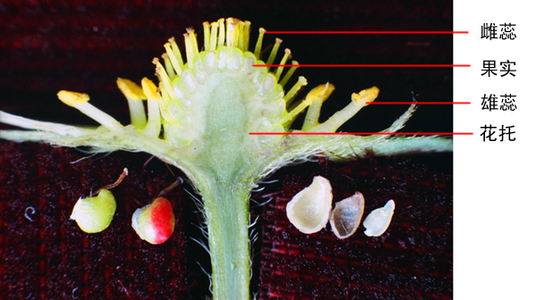 草莓發(fā)育中果實的縱剖可以看出,每個雌蕊形成的小果聚生在花托上,是聚合果 圖片來源:PPBC