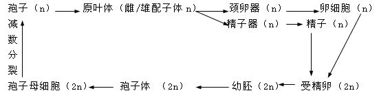蕨類植物的配子體是簡(jiǎn)單微小的葉狀體,稱為原葉體(prothallus,prothallism),頸卵器和精子器同體或異體而生,多數(shù)種類頸卵器和精子器都生于原葉體腹面,少數(shù)種類生于背面。