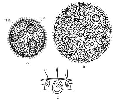 (2)團(tuán)藻屬(Vduox)。屬綠藻綱,團(tuán)藻目。藻體為多細(xì)胞群體,排列成球狀,球體內(nèi)充滿膠質(zhì)和水。群體組成的細(xì)胞形態(tài)和衣藻相同。無(wú)性生殖時(shí),群體中無(wú)鞭毛的大型細(xì)胞即生殖細(xì)胞進(jìn)行多次分裂,形成子群體,陷入母群體腔內(nèi),母體破裂后子群體放出。有性生殖為卵式生殖,群體中有些生殖細(xì)胞產(chǎn)生卵和精子,在母體內(nèi)受精形成厚壁合子,合子脫離母體后休眠,條件適宜時(shí)減數(shù)分裂后形成具雙鞭毛的游動(dòng)孢子,發(fā)育成植物體群體。團(tuán)藻經(jīng)常發(fā)生于淡水池塘或臨時(shí)積水中,2~3周后消失。