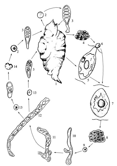 9.果孢子 10.幼體 11.絲狀體的孢子囊 12.殼孢子形成 13.殼孢子 14.小紫菜