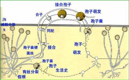 黑根霉的菌絲體多分枝,無橫隔,細(xì)胞核多數(shù),菌絲體有匍匐菌絲,稱為匍匐枝,匍匐枝與營養(yǎng)基質(zhì)接觸處產(chǎn)生假根吸取養(yǎng)料。黑根霉有無性繁殖和有性繁殖,無性繁殖時(shí)于假根處向上產(chǎn)生幾支直立的菌絲稱為孢子囊柄(sporangiophore),頂端形成球形膨大產(chǎn)生孢子的囊狀物,稱為孢子囊,囊中產(chǎn)生孢子,孢子成熟時(shí)黑色,散出,在適宜的介質(zhì)上萌發(fā)成菌絲體。有性生殖時(shí),兩個(gè)不同性別的菌絲體相遇,從其側(cè)面長出短枝形成配子囊,頂端相接處細(xì)胞壁消失,原生質(zhì)融合形成有厚壁的合子,合子休眠和減數(shù)分裂后萌發(fā)長出不分枝的菌絲,頂端形成孢子囊,孢子囊產(chǎn)生孢子,由孢子再萌發(fā)成新個(gè)體。