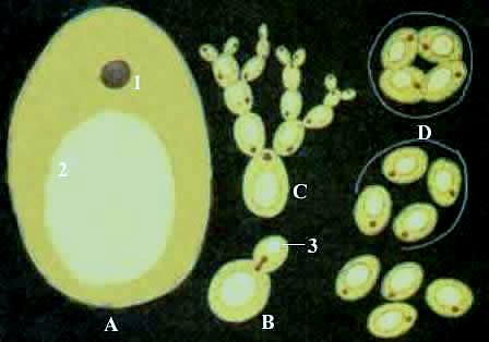 (1)酵母菌屬(Saccharomyces)。是子囊菌綱中比較低級(jí)的種類,單細(xì)胞,有明顯的細(xì)胞壁和細(xì)胞核,通常以出芽形式繁殖。有性繁殖形成子囊,子囊近球形,單細(xì)胞,減數(shù)分裂后產(chǎn)生4個(gè)子囊孢子,或再進(jìn)行一次有絲分裂后形成8個(gè)孢子。