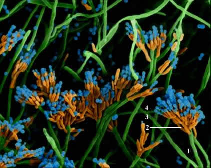 1.分生孢子梗 2.; 3.小梗 4.分生孢子