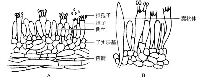 菌褶由子實(shí)層、子實(shí)層基(subhymenium)和菌髓(trama)三部分組成。菌褶的兩面均為子實(shí)層,主要由無隔擔(dān)子、側(cè)絲和囊狀體(cystidium)(隔胞)組成。無隔擔(dān)子由雙核細(xì)胞形成,其發(fā)育過程是:首先進(jìn)行核配,隨之進(jìn)行減數(shù)分裂產(chǎn)生4核,同時(shí)擔(dān)子體積增大,頂端產(chǎn)生4個(gè)小梗;小梗頂端膨大,各有一核進(jìn)入,共形成4個(gè)擔(dān)孢子。側(cè)絲是由不育的雙核細(xì)胞形成的。囊狀體是某些種類的子實(shí)層中存在的少數(shù)大型細(xì)胞,其長度可達(dá)相鄰的菌褶。子實(shí)層基是子實(shí)層下的一些較小的細(xì)胞。菌髓由一些疏松排列的長形菌絲構(gòu)成,位于菌褶中央。