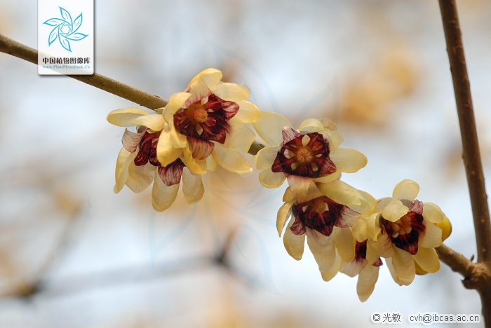 ④ 小花蠟梅‘Parviflorus’花特小,徑常不足1cm,外輪花被片淡黃色,內(nèi)輪花被片具紫色斑紋。
