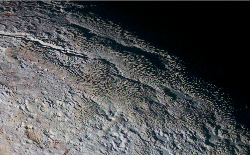 冥王星上非正式名稱為塔耳塔羅斯山脊(Tartarus Dorsa)的區(qū)域刃狀的地貌,由NASA的新視野號(hào)探測(cè)器在2015年7月拍攝。(圖片提供:NASA/JHUAPL/SwRI)