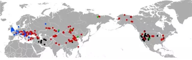 紅色為已滅絕鼠兔的化石分布點,藍色、綠色、黑色為一些現(xiàn)生種類的分布點。圖片:Wikipedia