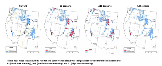 根據預測,氣溫升高,鼠兔的適宜生境將減少。圖上藍色區(qū)域為鼠兔目前的棲息地,紅色為未來不同溫度下的鼠兔棲息地。點擊圖片可放大。圖片:USGS