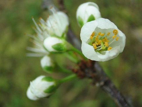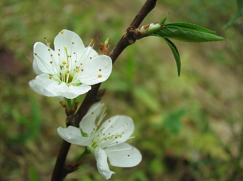 李,花葉同出,兩至三朵并生于枝頭,花蕊黃色,花梗較長。
