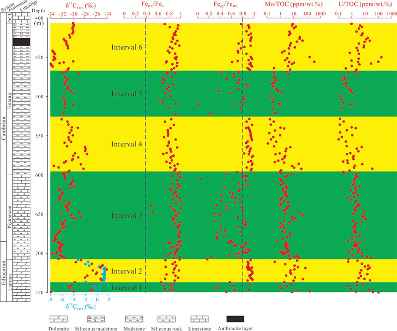 最近,由中國科學(xué)院南京地質(zhì)古生物研究所向雷助理研究員、張華副研究員等所組成的研究團(tuán)隊(duì),對浙江省西部一口井的鉆芯樣品進(jìn)行了系統(tǒng)的地球化學(xué)分析。所獲得的鐵組分?jǐn)?shù)據(jù)顯示,從埃迪卡拉紀(jì)藍(lán)田組到寒武紀(jì)第四階荷塘組自始至終都處于缺氧環(huán)境,未反映任何氧化水體。與此同時(shí),該套地層中還發(fā)育了3段連續(xù)的硫化環(huán)境。這套罕見的鐵組分?jǐn)?shù)據(jù)代表了前人所未報(bào)道過的寒武紀(jì)早期中國南方持續(xù)性的硫化水體環(huán)境。