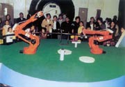 在投籃球機器人的旁邊,有一個機器人舞臺,機器人舞臺上有兩個機器人在表演。一個機器人問:“你有什么本領(lǐng)?” “我會舞太極劍,”另一個機器人回答。說著這個機器人就表演了一套太極劍,讓觀眾大開眼界。另一個機器人看完了太極劍也不甘示弱,玩起了它拿手的把戲——耍陀螺。先將一個陀螺拈轉(zhuǎn),然后又將另一個陀螺放在第一個陀螺上,玩起了疊羅漢的手藝,令觀眾拍手叫絕。