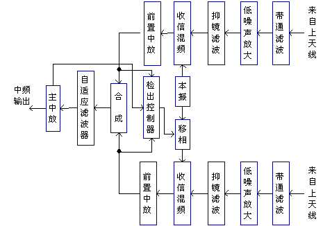 上圖是一個有空間分集接收的收信設(shè)備組成方框圖,分別來自上天線和下天線的直射波和經(jīng)過各種途徑(多徑傳播)到達(dá)接收點(diǎn)的電波,經(jīng)過兩個相同的信道,帶通濾波器、噪聲放大器、抑鏡濾波器、收信混頻器、前置中放,然后進(jìn)行合成,再經(jīng)主中頻放大器后輸出中頻已調(diào)信號。