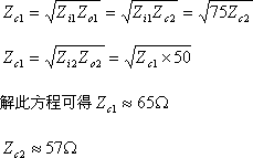 假設(shè)圖中的階梯式阻抗變換器其兩節(jié)1/4波長(zhǎng)同軸線外導(dǎo)體內(nèi)徑分別為D1和D2,相應(yīng)的特性阻抗分別為Zc1和Zc2。且左端第一節(jié)1/4同軸線的輸入阻抗與輸入端所接同軸電纜的阻抗相匹配,即Zi1=Z1=75Ω。而第二節(jié)1/4一波長(zhǎng)同軸線的輸出阻抗與輸出端所接同軸電纜的阻抗相匹配,即Zo2=Zo2=50Ω。同時(shí)為使兩節(jié)1/4同軸線之間匹配,應(yīng)有第一節(jié)1/4波長(zhǎng)同軸線的輸出阻抗等于第二節(jié)的特性阻抗,而第二節(jié)1/4波長(zhǎng)同軸線的輸入阻抗等于第一節(jié)的特性阻抗,即Zo1=Zc2、Zi1=Zc1。因此可建立以下聯(lián)立式