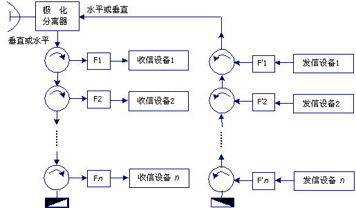 下圖中的F1、E2…分別為帶通濾波器,其等于波道的中心頻率。由天線接收到包含的多波道信號送到第一個環(huán)形器的①口,并從②口輸出,這時信號第一波道信號可從帶通濾波器F1通過,被第一波道的收信機接收,而其它波道信號被反射回第一個環(huán)形器的②口,并經此環(huán)形器從③口輸出。當這些信號經過第二個環(huán)形器時,以同樣的方式將送到第二波道的收信機,而將其余的信號反射回繼續(xù)傳向下一個環(huán)形器。這樣余下頻率成分信號均以同樣的方法逐個被送到各自的收信機中,從而完成了分波道的作用。