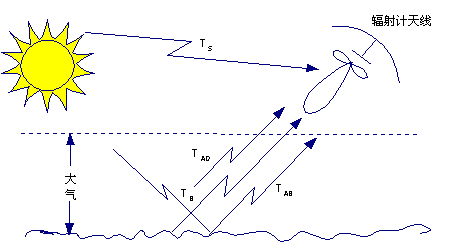 如圖,它表明從各種源接收噪聲功率的一個無線電輻射計天線。天線指向地球的一個區(qū)域,這個區(qū)域有地表的明亮溫度TB。大氣層在所有方向激發(fā)輻射,直接向著天線的輻射分量為TAR。在那里,還可能有從太陽或其它噪聲源來的噪聲功率進(jìn)入到天線的旁瓣。因此,由輻射計所測量的總明亮溫度,是觀察現(xiàn)場(場點)的函數(shù),以及觀察角、頻率、極化、大氣衰減和天線方向性的函數(shù)。應(yīng)用輻射計的目的是由測量的明亮溫度推論出有關(guān)現(xiàn)場的信息,無線電輻射機(jī)構(gòu)的分析是明亮溫度與現(xiàn)場的物理條件相聯(lián)系。例如,在沙子上有一層均勻分布的雪,雪上反射的功率可以被看作是平面波從多層電介質(zhì)的反射,從而引出一種算法,這種算法可以利用各種頻率下測得的明亮溫度給出雪的厚度。