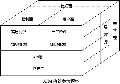 在ITU-T的I.321建議中定義了B-ISDN協(xié)議參考模型,如下圖。它包括三個面:用戶面、控制面和管理面,而在每個面中又是分層的,分為物理層、ATM層、AAL層和高層。
