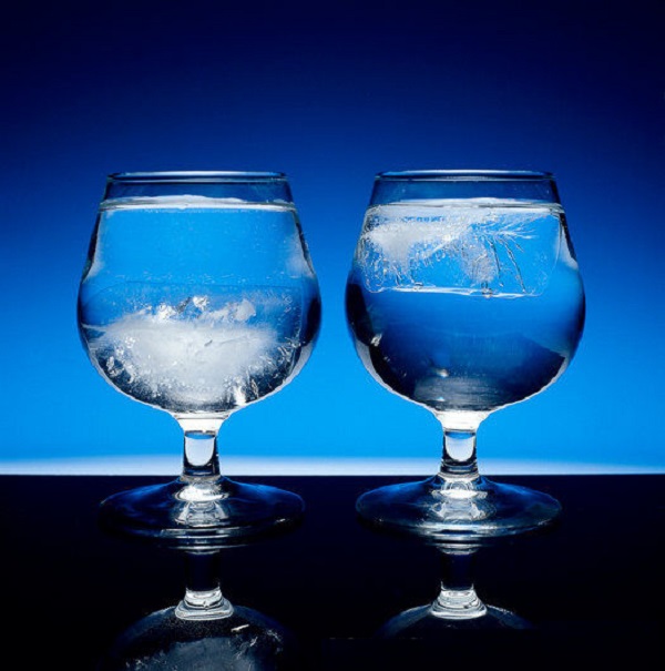 把重水凍成冰,它會(huì)沉入水中,而右邊的普通冰是浮在水上的