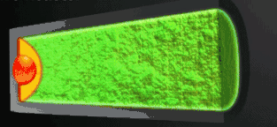 上圖為行波堆示意圖,黃色的為正在反應(yīng)的核燃料,綠色的為待增殖的核燃料,運(yùn)行時(shí),一邊消耗核燃料一邊又生產(chǎn)核燃料,核燃料利用率很高,燃燒和增殖就像一個(gè)波一樣,從反應(yīng)堆的一端慢慢移動(dòng)到另外一端,所以叫做行波堆。裂變區(qū)的移動(dòng)速度很慢,數(shù)十年不用換燃料。