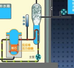第二回路上方有一個(gè)大水箱,叫做“事故冷卻水箱”,其在重力的作用下能長(zhǎng)時(shí)間連續(xù)流下,冷卻第一回路的水。