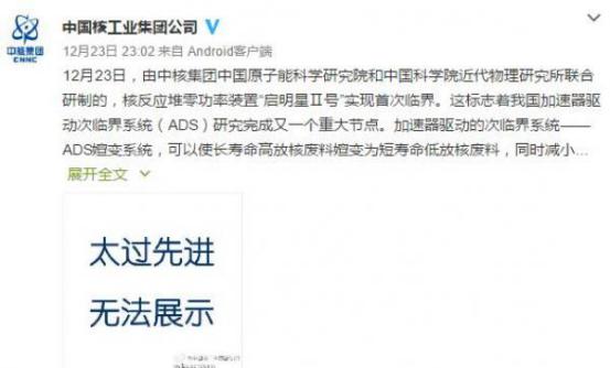 12月23日10點17分,中國首座鉛基核反應堆零功率裝置“啟明星 號”首次實現(xiàn)臨界。這標志著我國加速器驅(qū)動次臨界系統(tǒng)(ADS)研究完成又一個重大節(jié)點,也標志著我國在核反應堆新一代零功率裝置研發(fā)領(lǐng)域達到國際先進水平。中核集團微博發(fā)布消息的時候,配圖更是貼出了“太過先進,無法展示”。那么,加速器驅(qū)動次臨界系統(tǒng)到底有多先進,以至于“太過先進,無法展示”呢?