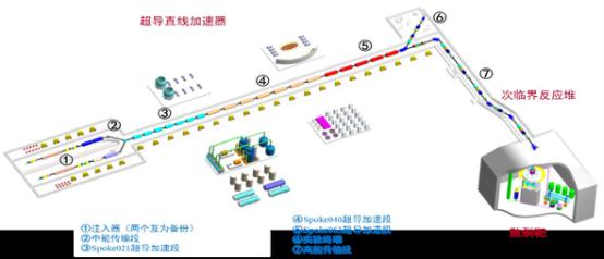 那么具體如何實現(xiàn)呢?這就離不開快中子反應堆和加速器驅(qū)動次臨界系統(tǒng)了。加速器驅(qū)動次臨界系統(tǒng)由強流質(zhì)子加速器、重金屬散裂靶和次臨界反應堆三大分系統(tǒng)組成。基本原理是利用加速器產(chǎn)生的高能強流質(zhì)子束轟擊重核產(chǎn)生寬能譜、高通量散裂中子作為外源來驅(qū)動次臨界堆芯中的裂變材料發(fā)生鏈式反應。次錒系核素與快中子發(fā)生裂變核反應,生成半衰期較短和毒性較小的裂變產(chǎn)物;長壽命裂變產(chǎn)物的嬗變主要通過熱中子俘獲、衰變等核反應過程生成短壽命或穩(wěn)定的核素。通俗地說,就是制造一個高放射性、長壽命核廢料的焚燒爐,將高放射性、長壽命核素轉(zhuǎn)化為中短壽命、低放射性核素或穩(wěn)定核素。同時,在這個過程中還會釋放能量,這些能量可以用來發(fā)電,等于將核廢料變成了可以用于發(fā)電的核燃料,實現(xiàn)變廢為寶。