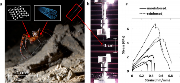 普通的蜘蛛絲已經很堅韌,科學家使用碳納米管和石墨烯,可以使普通的蜘蛛絲變得更強韌。意大利特倫托大學的Nicola Pugno教授帶領的一個研究團隊,成功地使蜘蛛吐出的蛛絲強度提升了3倍,韌性提升了10倍。?