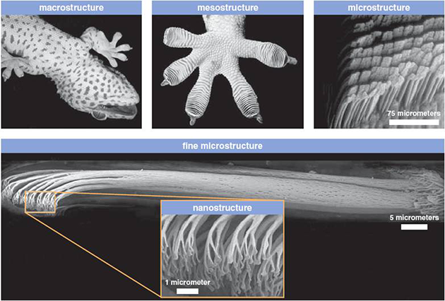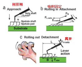 我們經常看見壁虎在垂直的墻面或建筑物的天花板上奔走,經過研究發(fā)現,壁虎并沒有像有些生物那樣分泌粘液把自己”粘“在墻面上,如果有粘液的話也不會跑得那么快。這都得益于腳掌上具有多分級纖維狀黏附系統(tǒng)。壁虎的每個腳趾生有數百萬根細小剛毛,每根剛毛的長度約為30-130微米,直徑為數微米,約為人類頭發(fā)直徑的十分之一。剛毛的末端又分叉形成數百根更細小的鏟狀絨毛(100-1000根),每根絨毛長度及寬度方向的尺寸約為200納米,厚度約為5納米,結構非常精細、復雜。?