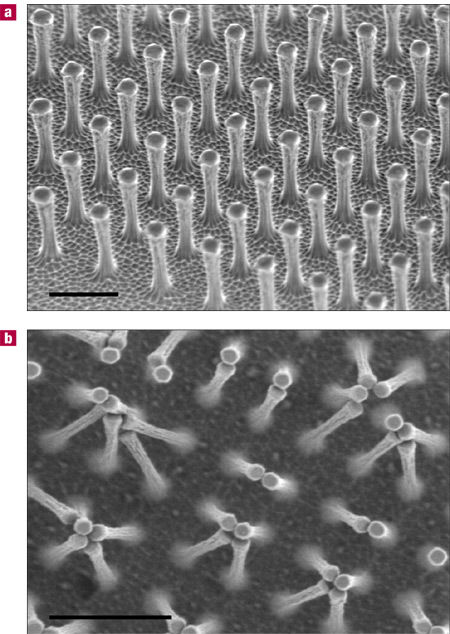 英國曼徹斯特大學的安德烈 K 海姆教授注意到壁虎剛毛的這種多層級微納、尺度介觀結構之后,馬上聯想到是否可以制造出一種膠帶,擁有類似壁虎腳掌的剛毛絨毛系統(tǒng),具有強大吸附力的同時還可以吸脫自如。?