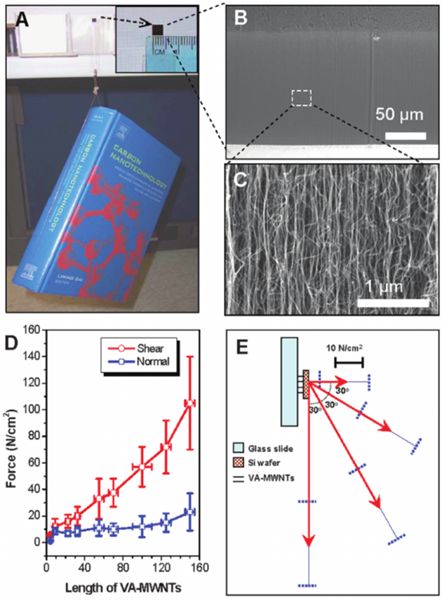 圖8 A:利用碳納米管陣列制成的壁虎膠帶吊起一本1480克重的書,B-C: 碳納米管陣列的形貌,? D-E:? 壁虎膠帶的力學性能測試結果[4]?