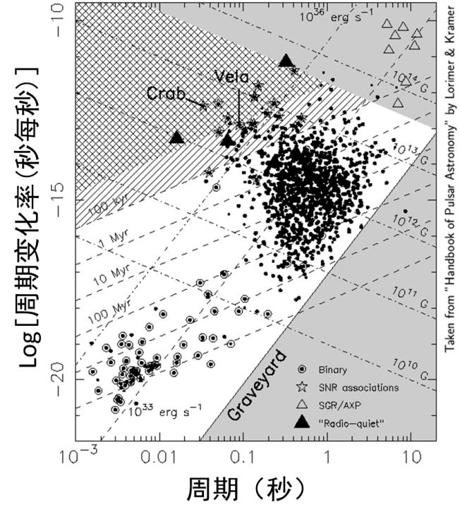 圖2 脈沖星“周期/周期變化率”關系圖。注意圖中橫軸使用了對數(shù)坐標,縱軸雖然是線性坐標,但數(shù)值是取對數(shù)之后的。圖片來自《脈沖星天文學》(英文)一書。