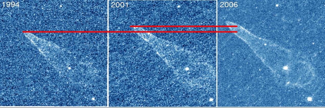 圖5 哈勃望遠鏡于不同年份拍攝的吉他星云,能明顯看出星云變長了。注意,圖中背景恒星的位置是相對固定的,只有星云形狀變化。