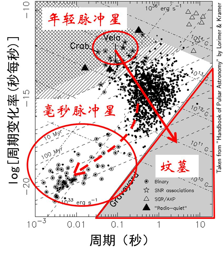 圖6 正常情況下,脈沖星大致沿著帶箭頭紅色實線生老病死。小部分脈沖星靠著吸積伴星物質(zhì),沿著帶箭頭紅色虛線發(fā)育成毫秒脈沖星。