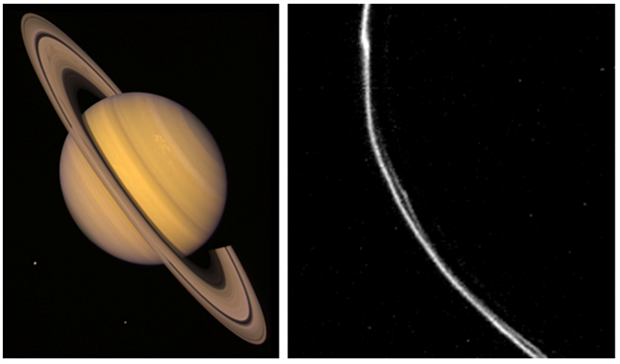 土星光環(huán)的本質(zhì)讓幾個世紀的天文學家感到困惑。19世紀,美國天文學家基勒指出,土星光環(huán)由不連續(xù)的很多微粒組成,并非單一連續(xù)剛體——這在我們今天看來,是顯然的,沒有任何物體能承受那么大的剪切力而不碎裂。這在1981-1982年旅行者一號、二號探測器飛越土星之后,變得再明顯不過:旅行者號對土星光環(huán)所攝得的照片中,我們已經(jīng)發(fā)現(xiàn)了土星光環(huán)微粒在引力擾動下所呈現(xiàn)的一些暫現(xiàn)形態(tài),一個動態(tài)的、有生命力的土星光環(huán)已經(jīng)呼之欲出。