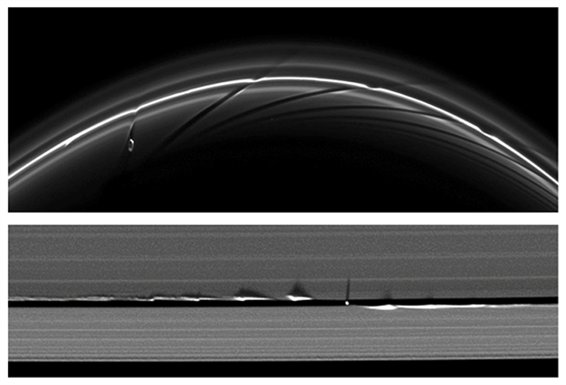 上圖為土衛(wèi)十六與F環(huán),下圖為春分附近的土衛(wèi)三十五與基勒環(huán)縫