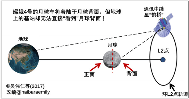為了解決挑戰(zhàn)月之背面的通訊難題,我國(guó)已在半年前(5月21日)預(yù)先發(fā)射了一枚通訊中繼衛(wèi)星“鵲橋”,作為接下來的著陸器/月球車與地球進(jìn)行通訊的“橋梁”。這枚人類首顆位于地月拉格朗日L2暈軌道(halo軌道)的通訊中繼衛(wèi)星已于6月14日順利抵達(dá)預(yù)定軌道。
