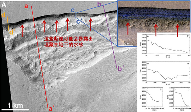 中緯的斷崖中暴露出的純凈水冰。來源:[6]