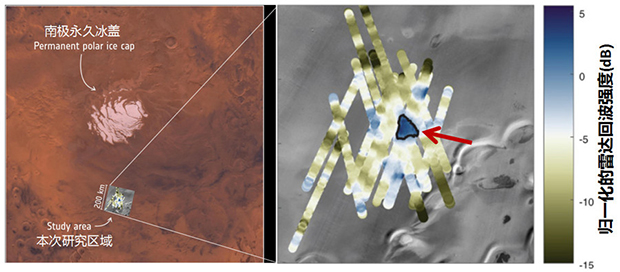 可能的液態(tài)水湖所在的區(qū)域(右圖藍(lán)色三角區(qū)域內(nèi))來源:ESA和參考文獻(xiàn)[9]