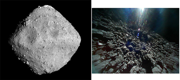 (左)隼鳥2號(hào)拍攝的直徑約900米的小行星“龍宮”;(右)MINERVA-II-1B著陸后拍攝的“龍宮”表面。來源:JAXA