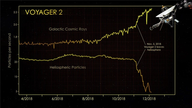 旅行者2號(hào)攜帶的宇宙射線探測(cè)儀(CRS)顯示,11月5日后,旅行者2號(hào)周圍探測(cè)到的來自日球?qū)觾?nèi)的粒子驟減,而來自宇宙射線的粒子驟增。來源:NASA