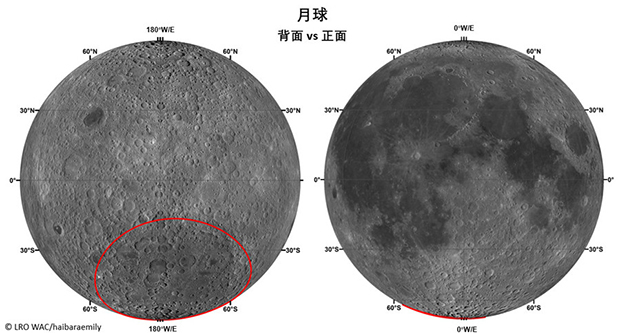 盤踞月球背面南半球的南極艾肯盆地(紅圈內(nèi))是嫦娥4號(hào)的目標(biāo)。根據(jù)LROCWAC影像繪制。