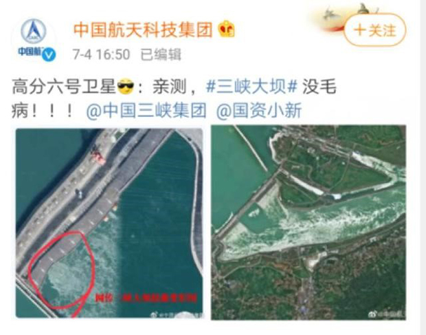 同時,中國航天科技集團也出面辟謠,專門拿出我國高分辨率、高質(zhì)量成像、高效能成像的“高分六號”衛(wèi)星,以一種“用牛刀殺雞”的方式,展現(xiàn)了并無異常的三峽大壩的圖片,再一次澄清了此事。