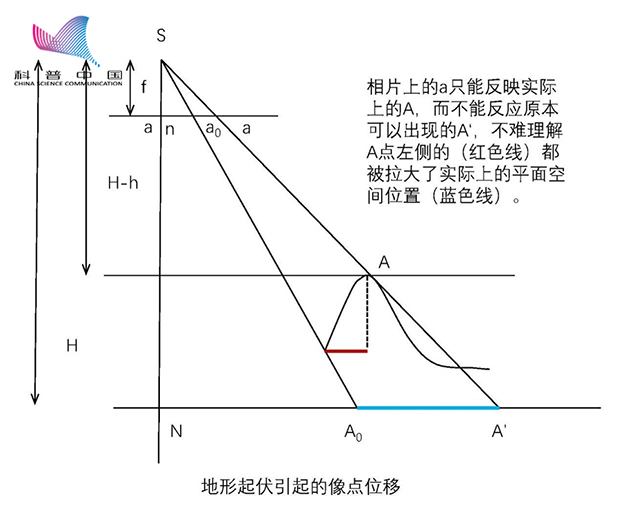 第二類問題也是如此,由于我們拍攝的地表地貌不是全都是一馬平川的,因此地表的起伏會導致像點的偏移,見下圖。