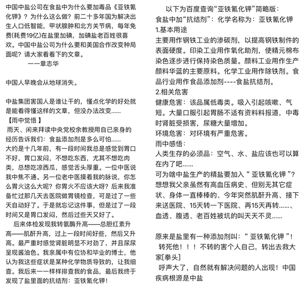 最近有個(gè)帖子在朋友圈瘋狂被轉(zhuǎn)發(fā),說“中國中鹽公司在食鹽里加了一種叫做亞鐵氰化鉀的“毒品”,是工業(yè)用的,會(huì)使人不明原因地死亡。這個(gè)東西是跟美國公司合作要滅亡中國人,歐美人自己都不吃亞鐵氰化鉀,只推薦其他國家吃?!?span lang="EN-US">????