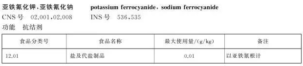 國家標(biāo)準(zhǔn)規(guī)定,亞鐵氰化鉀是一種抗結(jié)劑,圖片來自GB2760????
