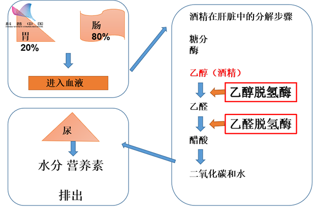 酒精進(jìn)入人體的分解圖:酒精進(jìn)入身體后,20%被胃吸收,80%被腸吸收,吸收后的酒精進(jìn)入血液并被運(yùn)輸?shù)礁闻K中,在肝臟中分解,再由尿排出體外。